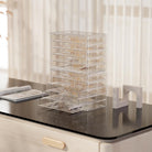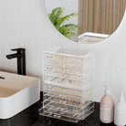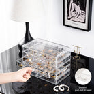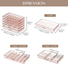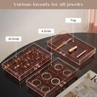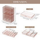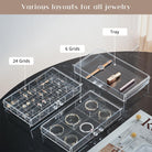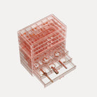 - It has 5 drawers, including 3 x 24 small cells for earrings and rings, 1 x 6 large cells for bracelets, and 1 x empty compartment drawer for necklaces, watches, lipstick, and other sundries