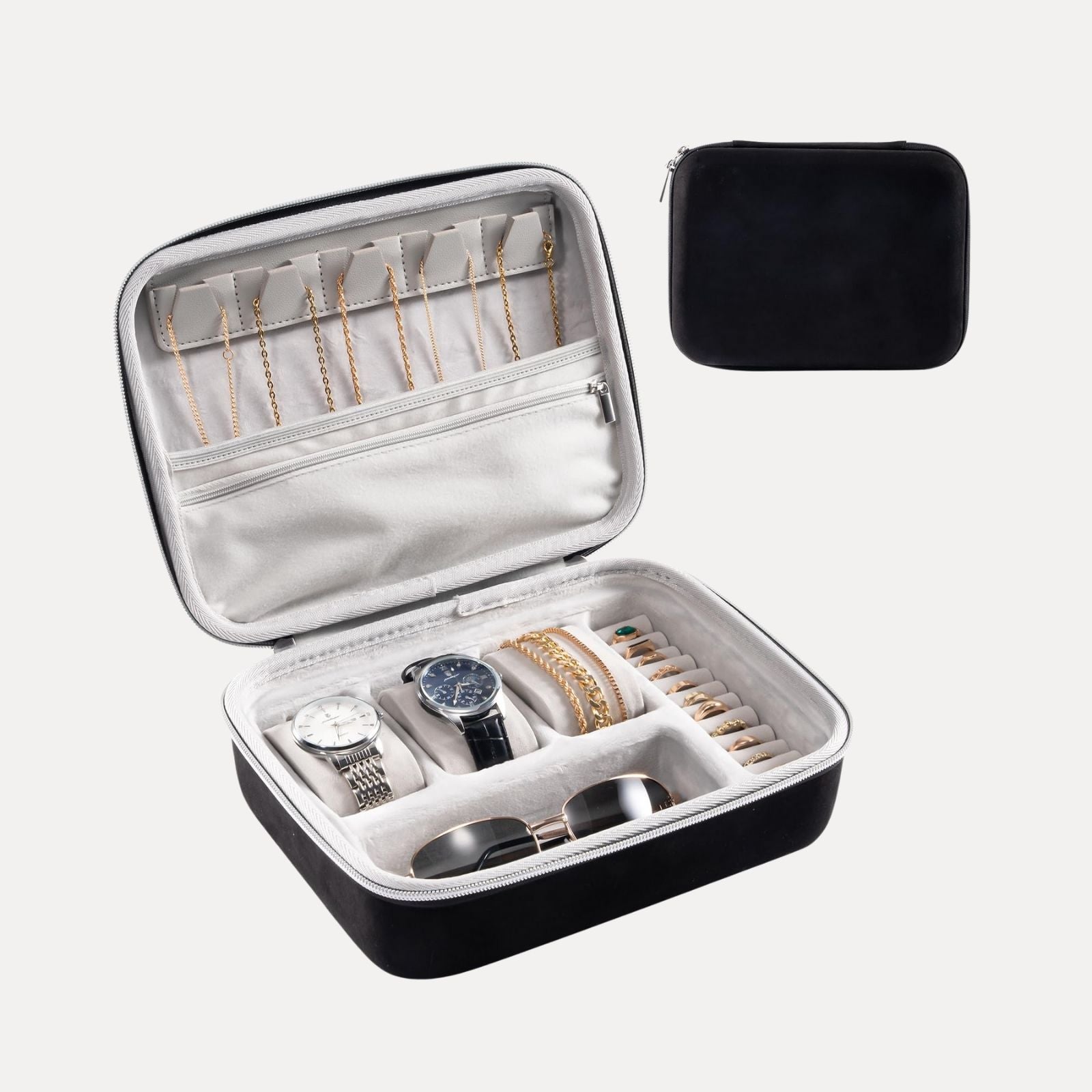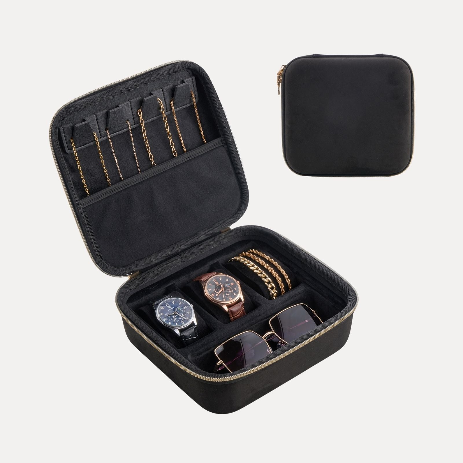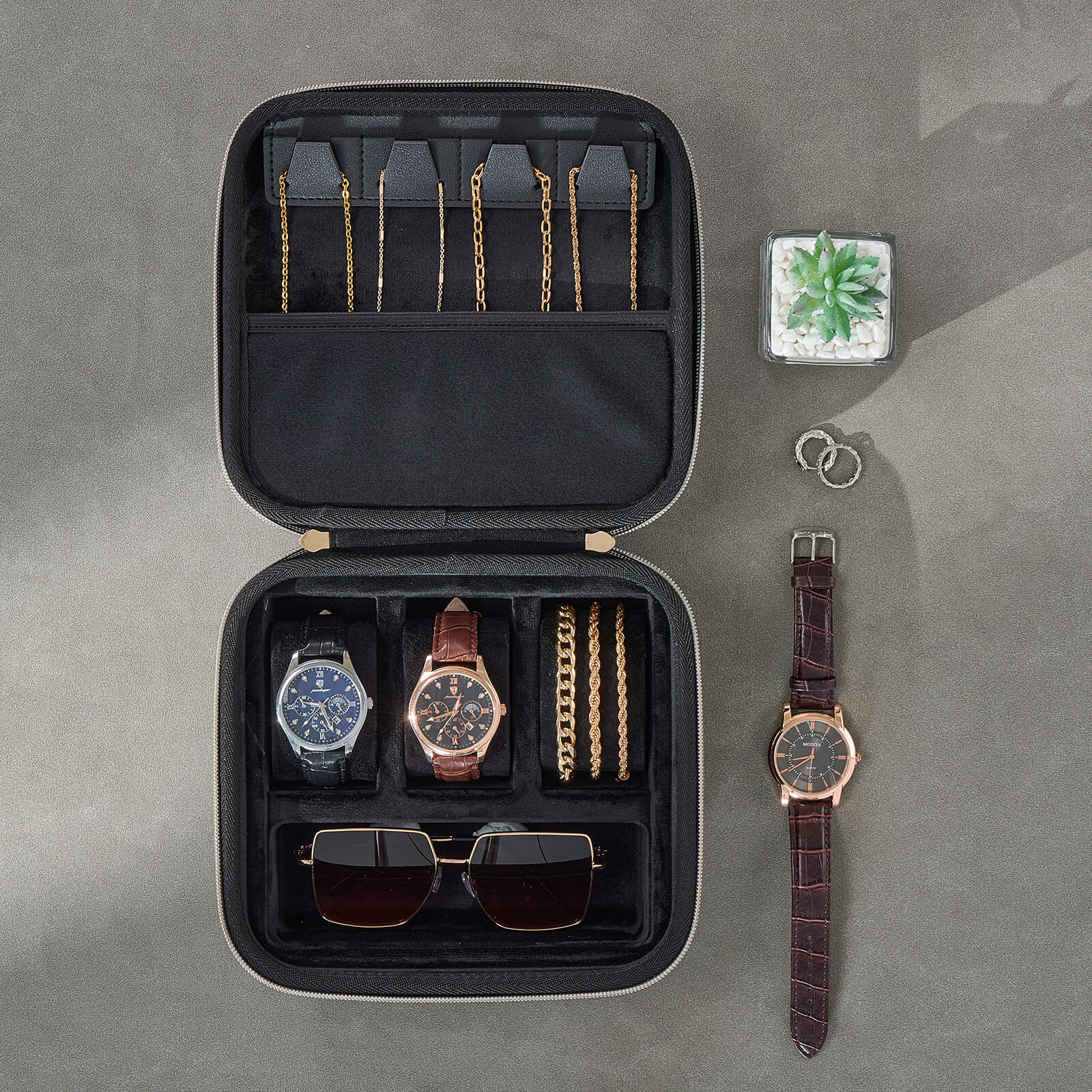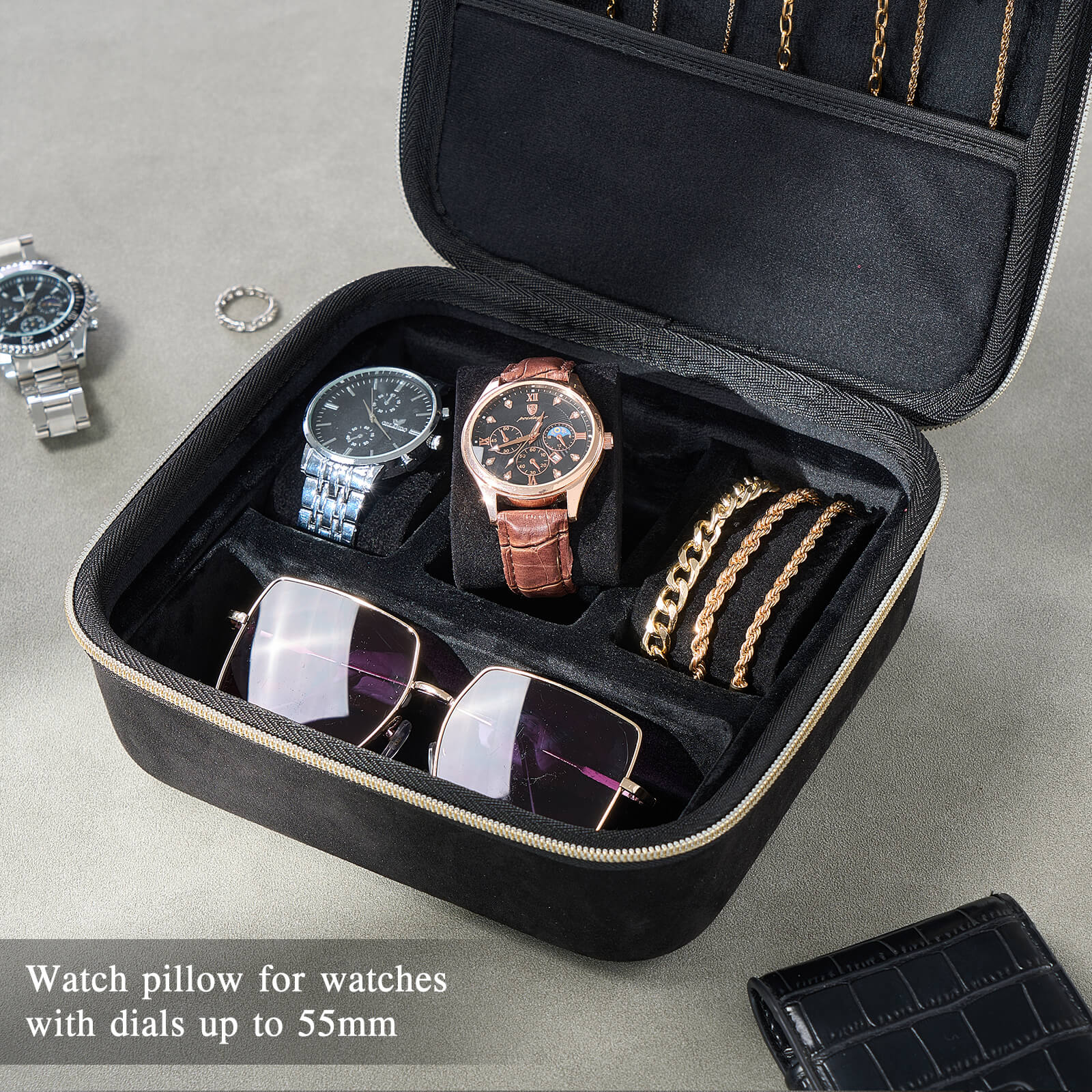 - Multi-functional travel jewelry organizer: 3 watches + 1 sunglasses + accessories slot + 5 necklace hooks