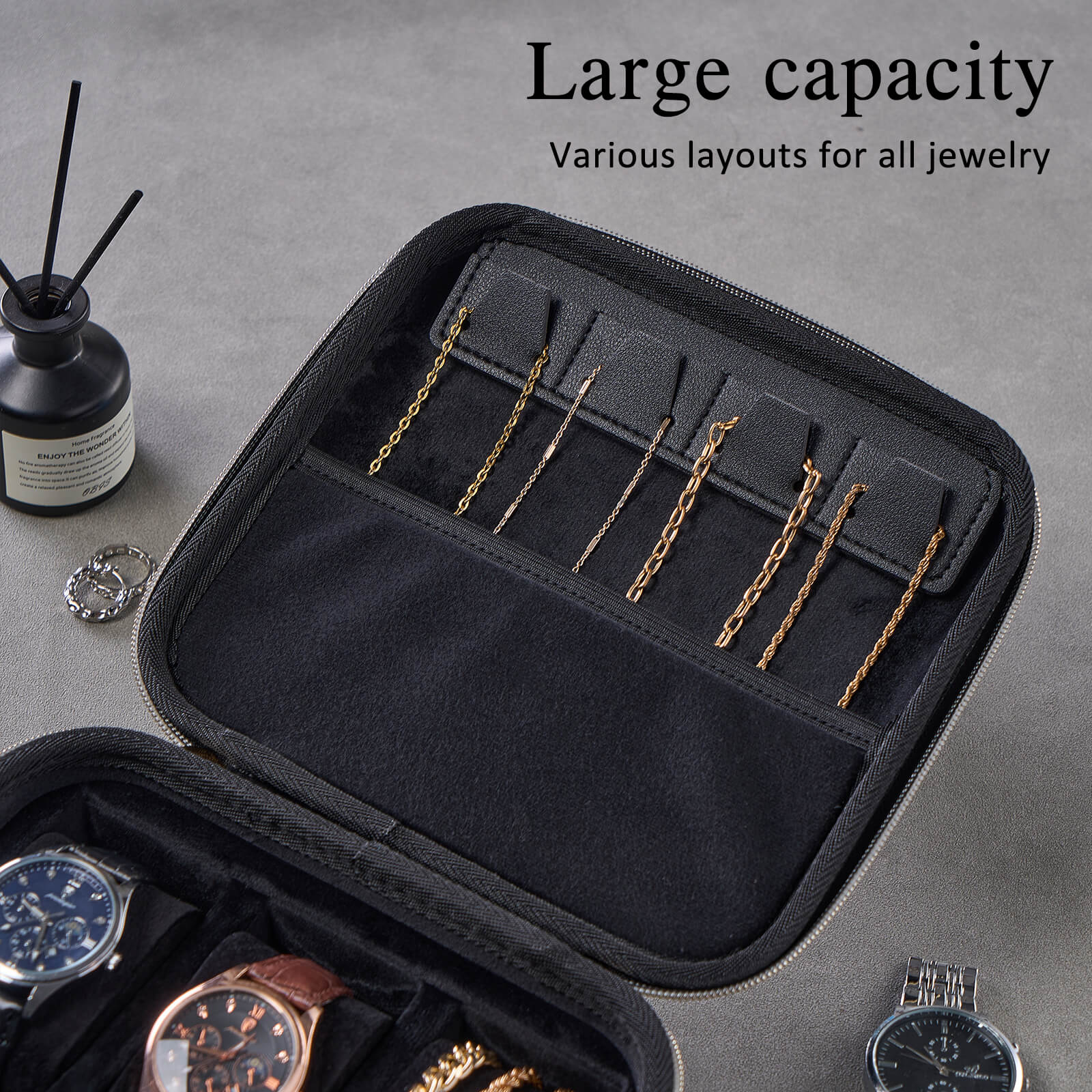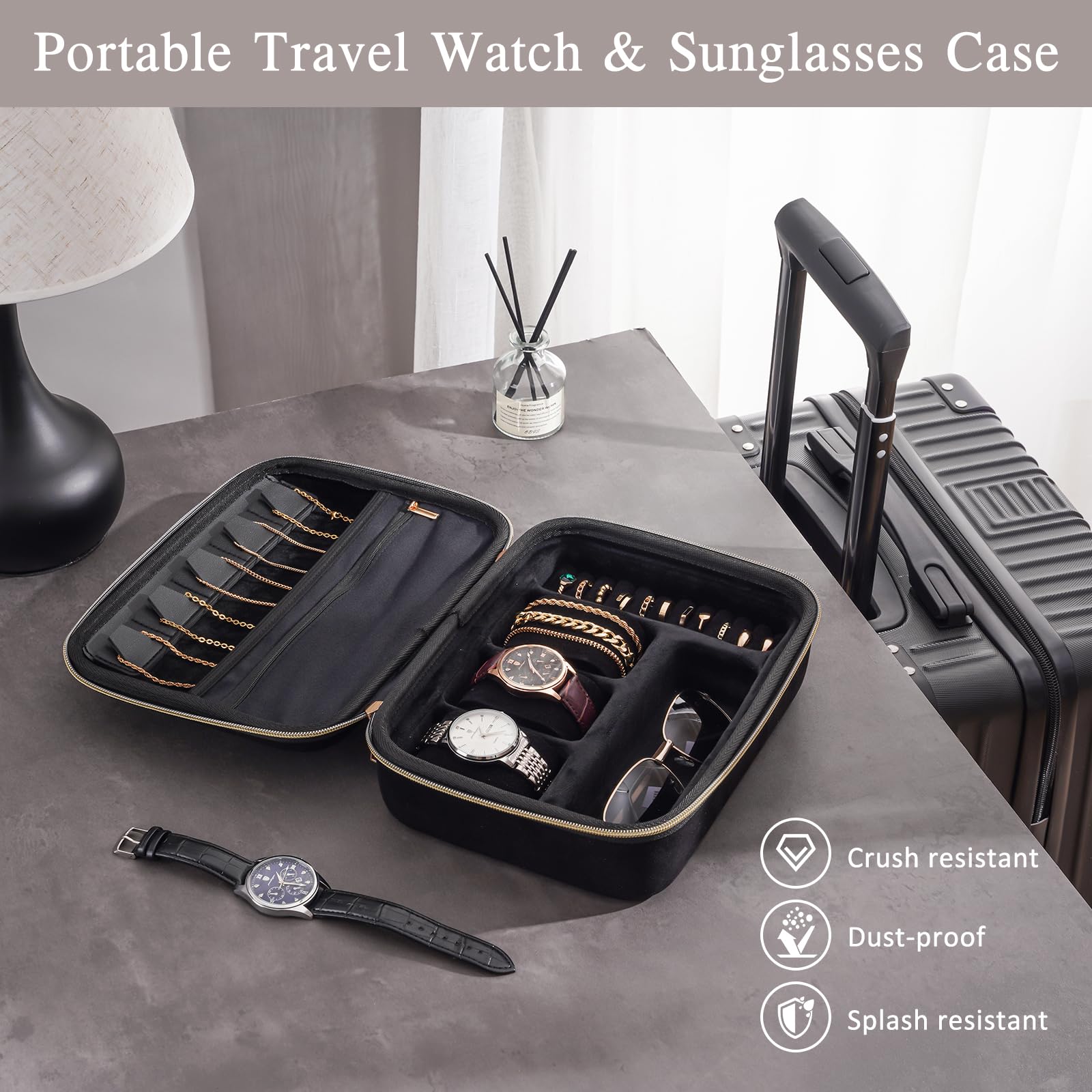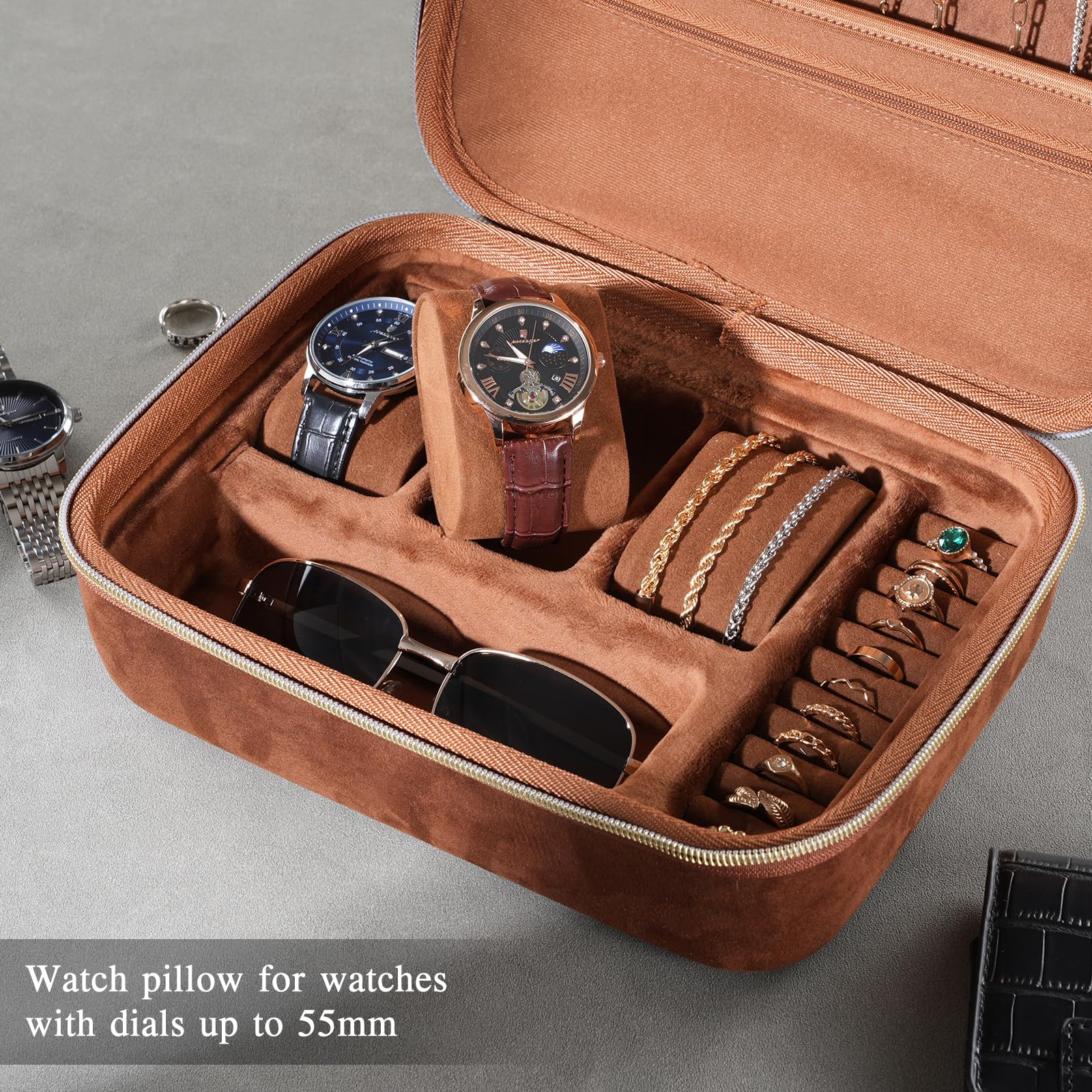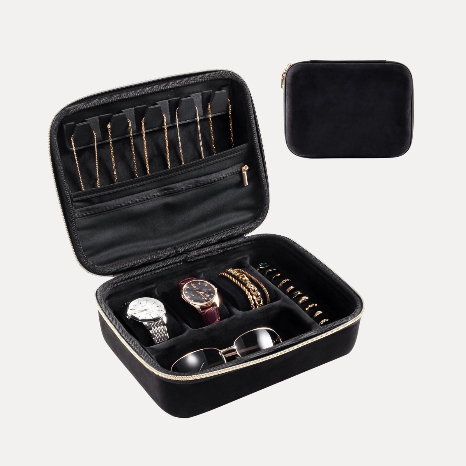 - Multi-functional travel jewelry organizer: 3 watches + 1 sunglasses + accessories slot + 5 necklace hooks
