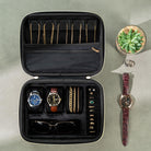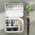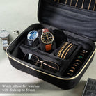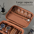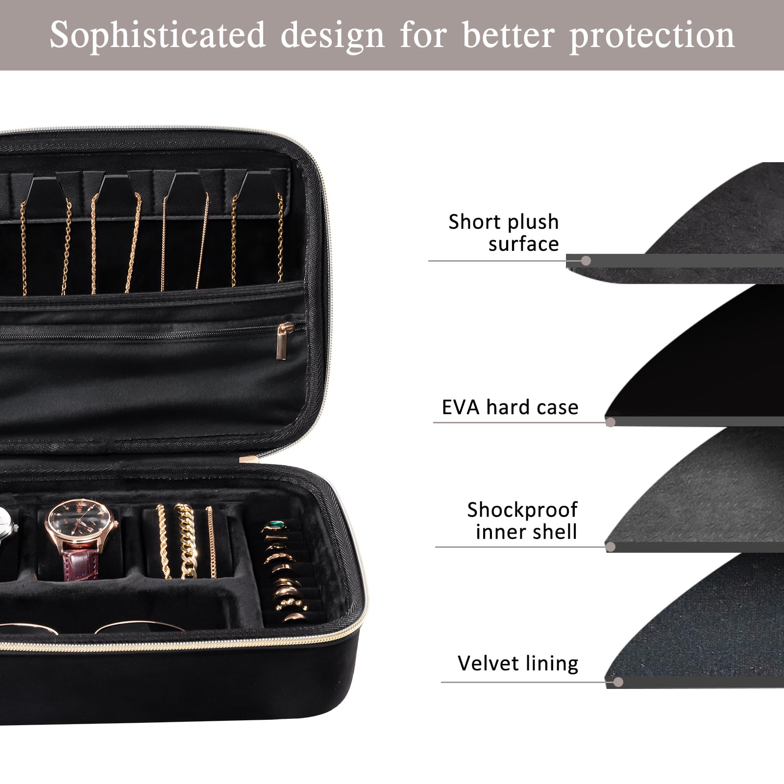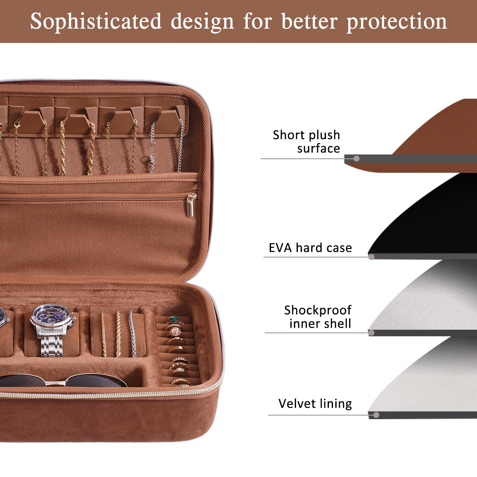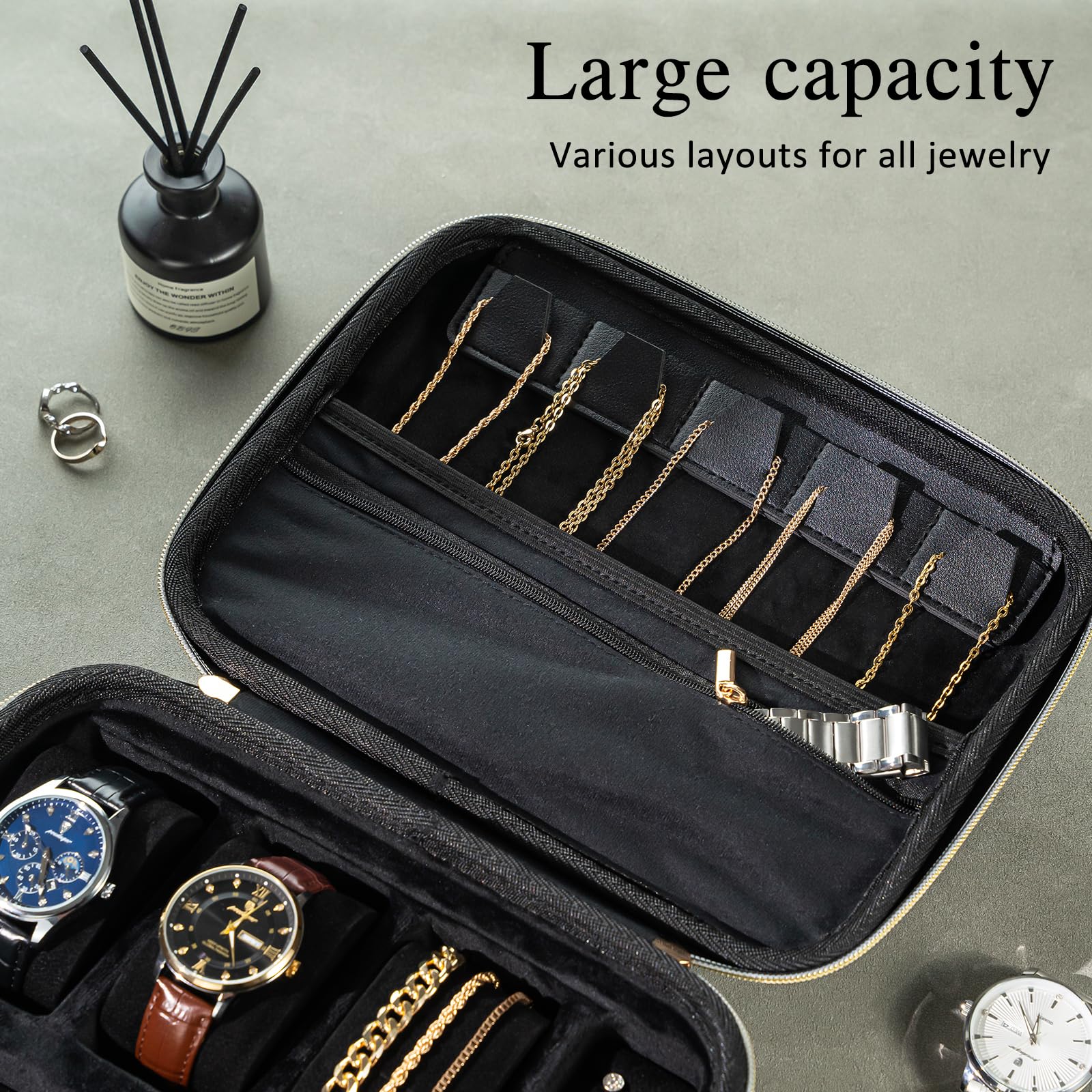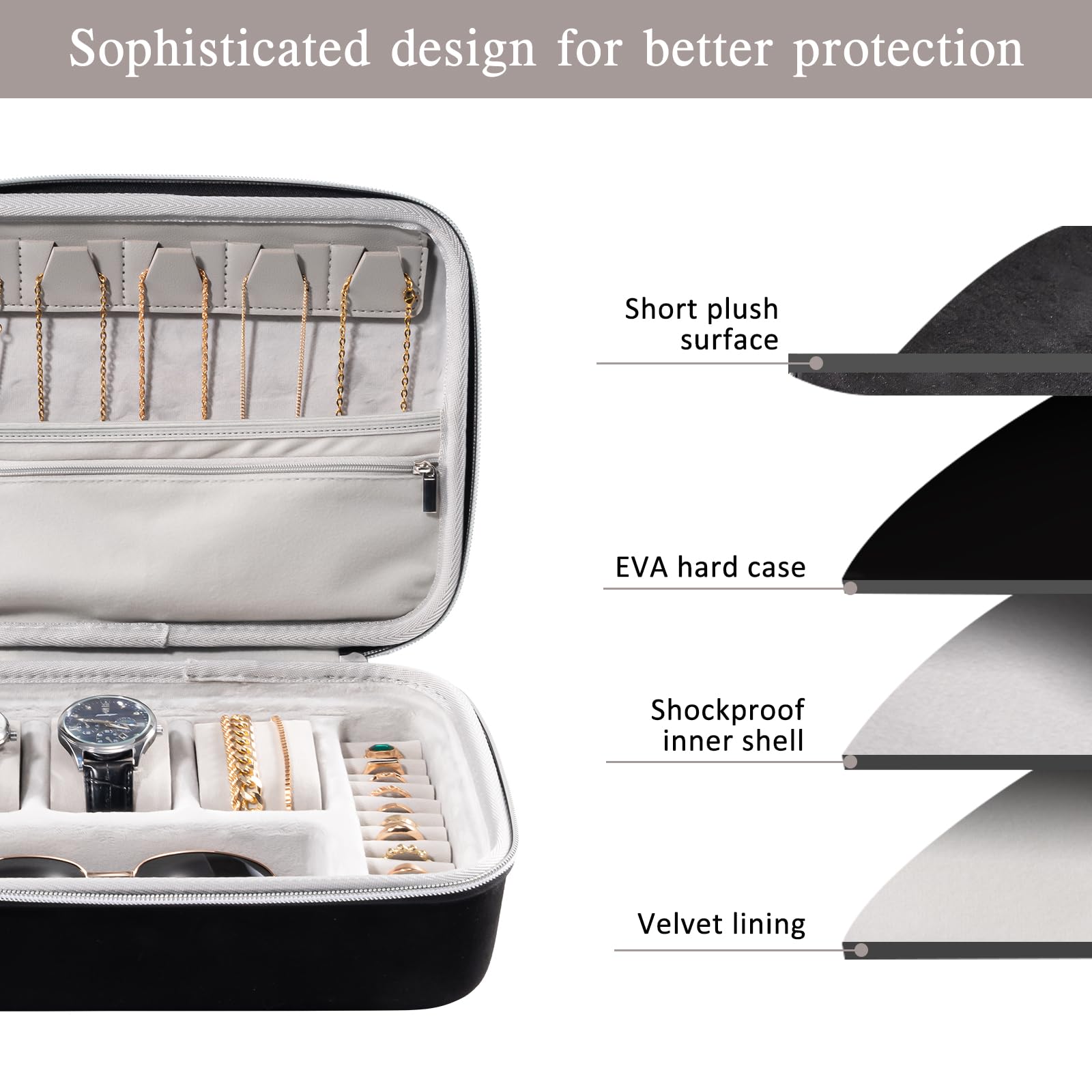 - Multi-functional travel jewelry organizer: 3 watches + 1 sunglasses + accessories slot + 5 necklace hooks
