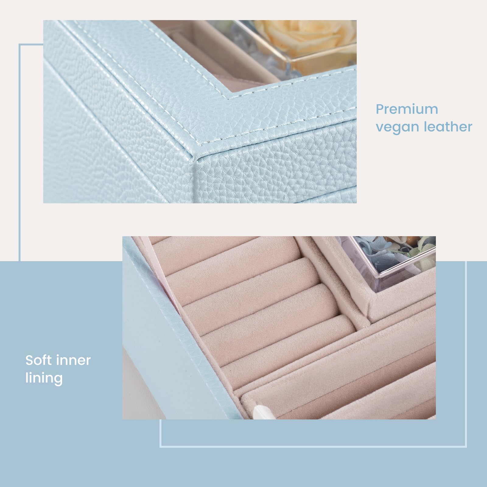 - Premium PU leather and velvet lining protect your precious items from scratches while offering you a luxuriously soft touch. Sturdy construction with smooth-gliding drawers ensure effortless use