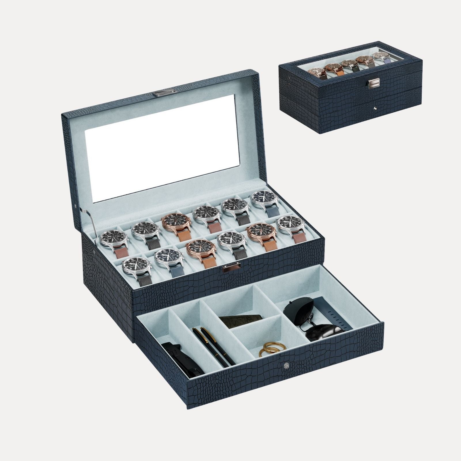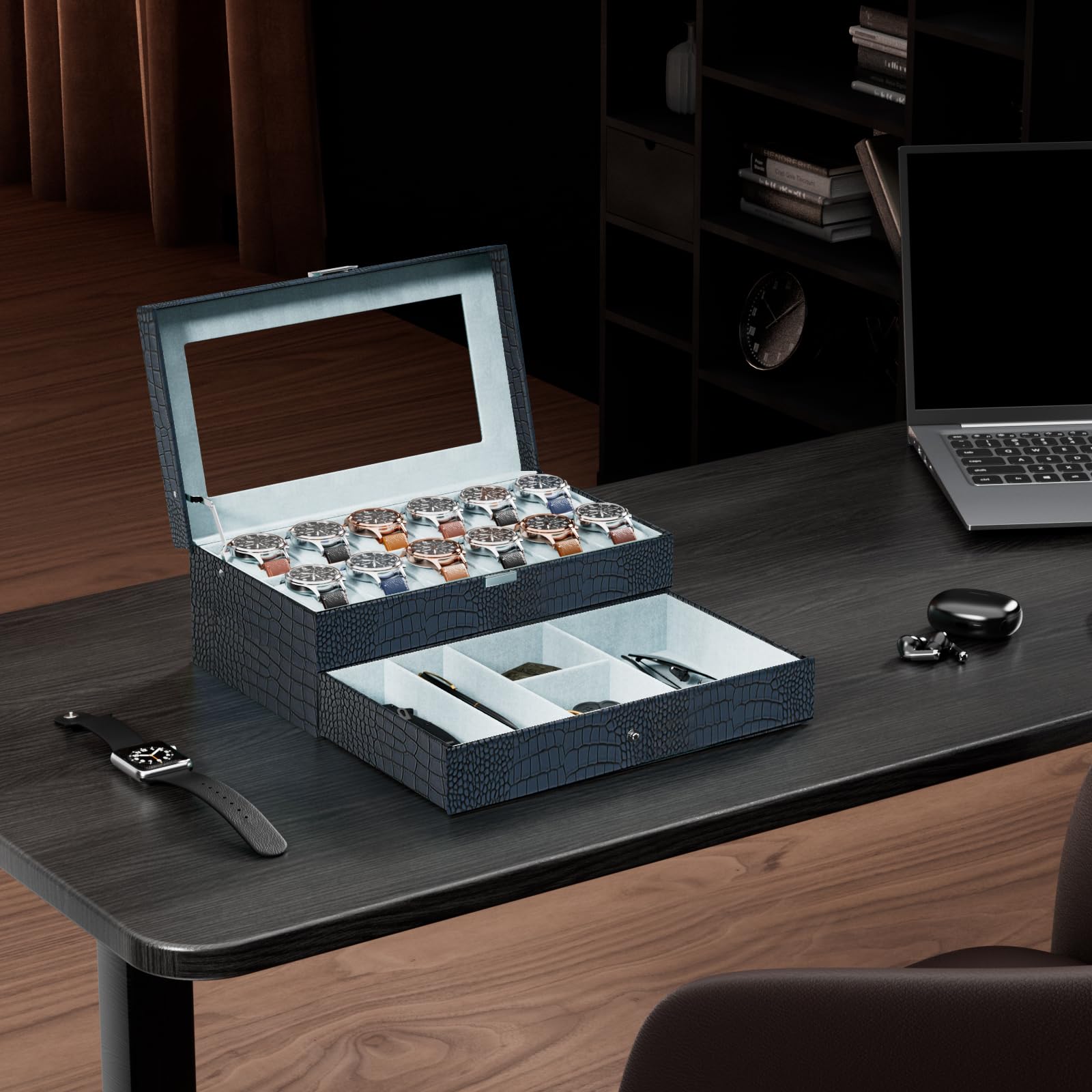 The top layer holds up to 3 watches, while the bottom drawer stores watch bands, cufflinks, bracelets, rings, pens, and other accessories¡ªkeeping everything organized and protected.